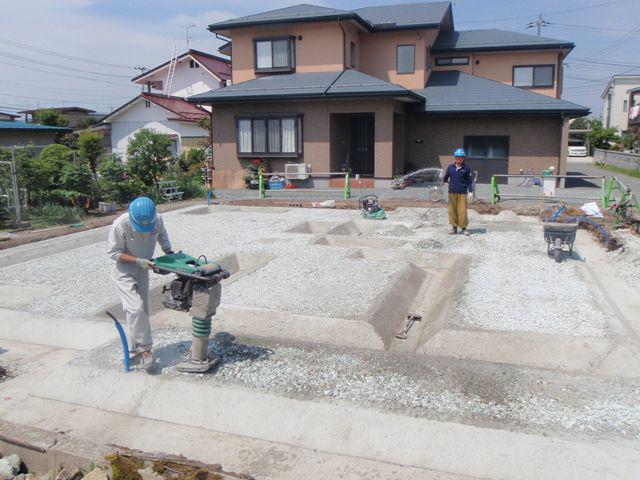 土間砕石の転圧を行っています。