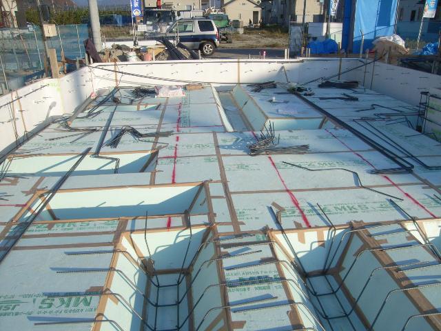 基礎耐圧盤下の断熱材敷きが完了し、本日から鉄筋やさんが乗り込みです。