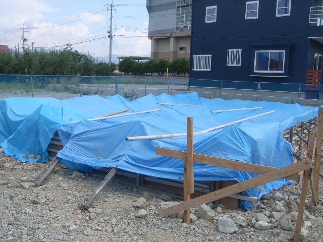 コンクリートが急激に乾燥しないようにブルーシートで養生しています