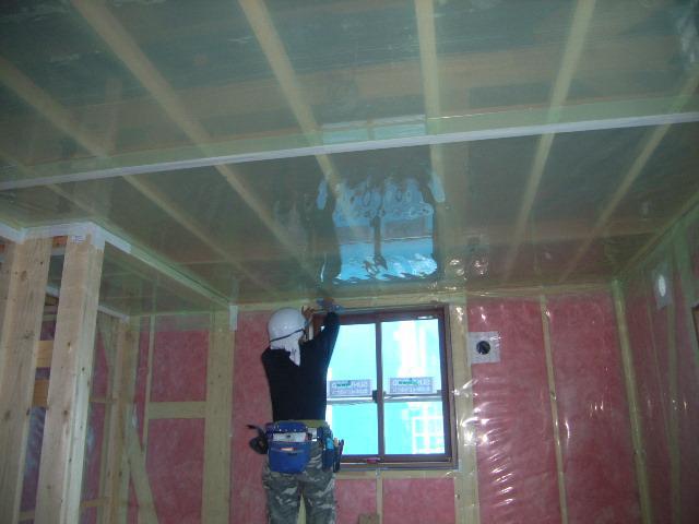 2階 天井の気密フィルムを貼っています。
