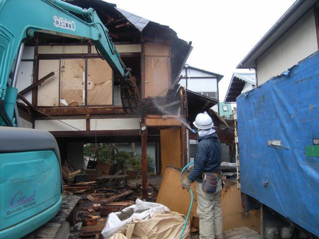 飛散防止のため、散水しながらの解体作業です。