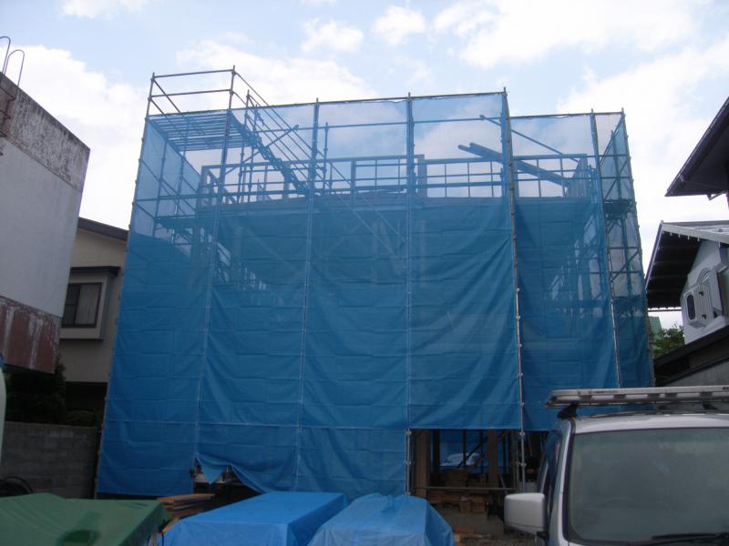 こちらは屋根の状況です。陸屋根の下地も完成し、シートで雨養生をしています。