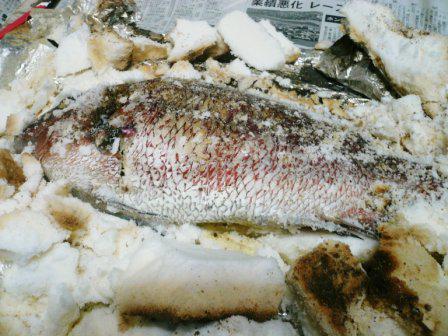 鯛を塩で分厚く包み、アルミホイルを巻いて、炭火でゆ〜っくり