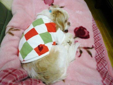 夕方は、遊びつかれたのでしょう。お気に入りのピンクの毛布