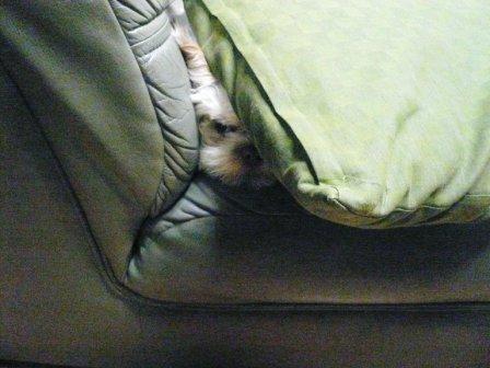グリーンのクッションは「スピア」がイジケて、自分で頭に乗せたんです。