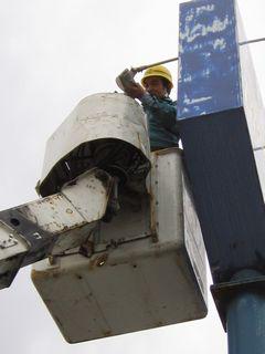 外看板の電球を取替えにやってきてくれたE君。