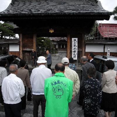 戊辰戦争の折、天童織田藩が官軍だったことから、幕府を擁立する庄内軍からことごとく寺や民家に火を放たれたことなど、寺の住職のお話を聞きました。この本堂は100年前に再建されたもの。瓦葺で重厚な造りです。