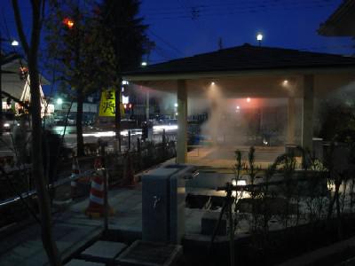 夕方から、完成したばかりの浴槽へ実際に温泉を入れる実験をしました。気温も日暮れとともに低下し、あたり一面湯けむりがもうもうと立ち込めています。