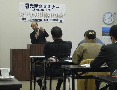 天童商工会議所観光部会のセミナーが、温泉組合事務所で開催されました。テーマは、「大河ドラマ天地人にみる戦国時代の出羽の国の歴史」。