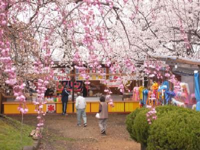 雨も上がったので、お昼に舞鶴山の開花状況を見てきました。山頂には売店も出揃って、お祭りにつきもののお好み焼きや綿菓子、アニメキャラクターのお面などが売られています。