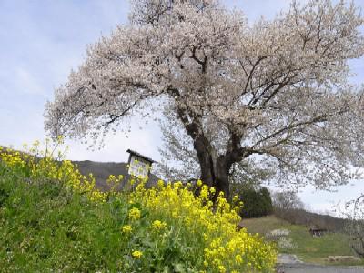 このサクラは、当館から車で5分の貫津(ぬくづ)地内にある「種まき桜」。見晴らしのきく場所に根を下ろし、樹齢約300年の大木で、天気の良い日はここから月山が見えます。