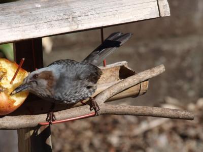 一番多いのが、すずめ。グループでやってきます。次がヒヨドリ、メジロと続きます。たまにシメやカワラヒワ、オオルリなどがやってくることもあります。この鳥はヒヨドリ。大振りの鳥で、これが来ると、他の小鳥たちはサッと散っていきます。