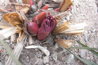 土を持ち上げ、膨らんできたシャクヤクの芽。魅力的なワインレッドの花が、今年も楽しみです。昨年は、五月下旬が見ごろでした。