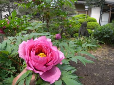 夕方から急に雲行きが怪しくなり、突然の雷鳴とともに激しく降りだした雨・・・。せっかく咲き出した中庭のボタンの花も、これで散ってしまうのかと心配しましたが、ご覧のとおり大丈夫でした。