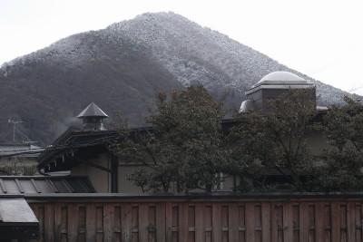 当館の玄関に向かって真正面に、湯上山(ゆのかみやま・標高450メートル)が見えます。ご覧のように、左右対称のなだらかな稜線が美しく、天童温泉のランドマーク的な山です。かつて村の名前から「津山冨士」とも言われてきました。夕べの雪でうっすらと雪化粧・・・。