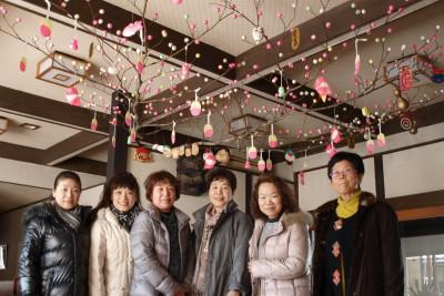 というわけで、今年もこんな風に賑々しく玄関ロビーを飾りました。完成したばかりのだんご木の前で、毎年おいでになるお客様にモデルになっていただきパチリ・・・。