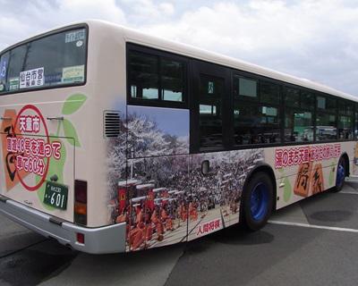 天童の観光広告を全面にラッピングした仙台市営バスが、いよいよ仙台市内を運行します。期間は来年3月まで。