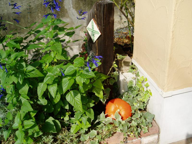 買ってきて玄関先の緑の中に置いてみました。