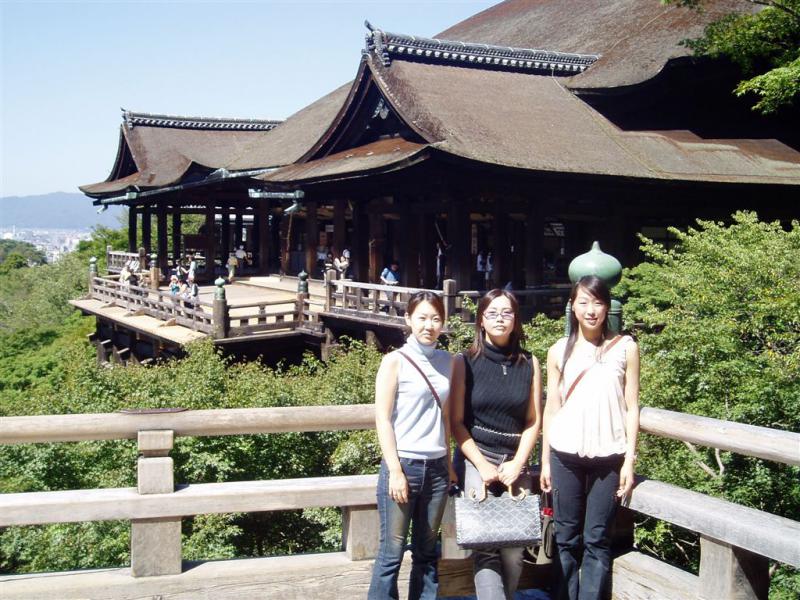 この本堂は国宝で、清水の舞台には釘が1本も使われていなくて、18本の太柱に縦横139本の硬いケヤキだけで組まれたものだそうです。