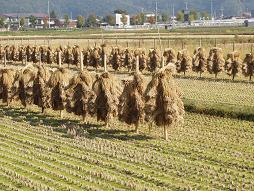 稲穂をかけて太陽でかわかしている風景に出会いました。
