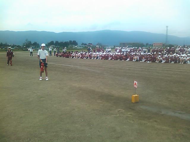 火災を想定した避難訓練後、消火器を使い方を研集しています。