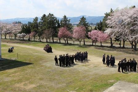 校舎西側の桜の木を背景に、3年生の卒業アルバムのためのクラス写真撮影が行われました。