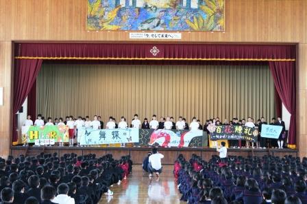 生徒集会にて学級目標発表会が行われました。各クラスの目標と教室に掲げるスローガンが工夫を凝らした演出で発表されました。