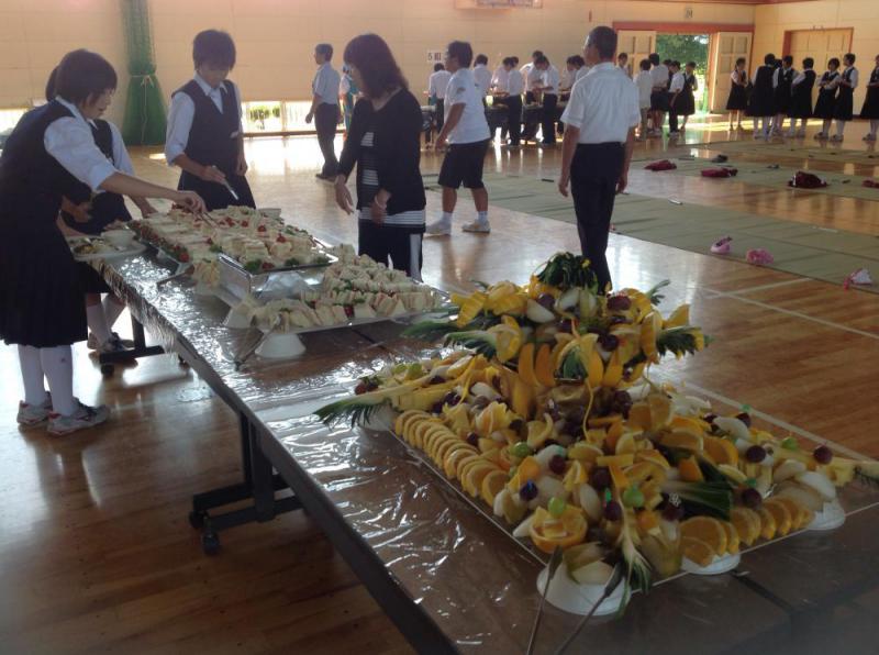 3年生の卒業記念としてバイキング給食が行われました。中央には綺麗に彩られたフルーツ盛り合わせとサンドイッチが。食べるのがもったいないくらい綺麗です。