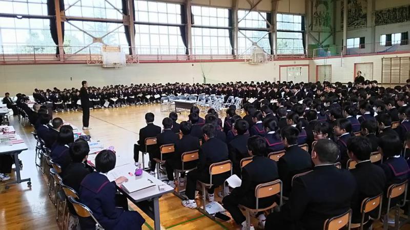 体育館のネット修理のため通常の半分のフロアで生徒総会が行われました。