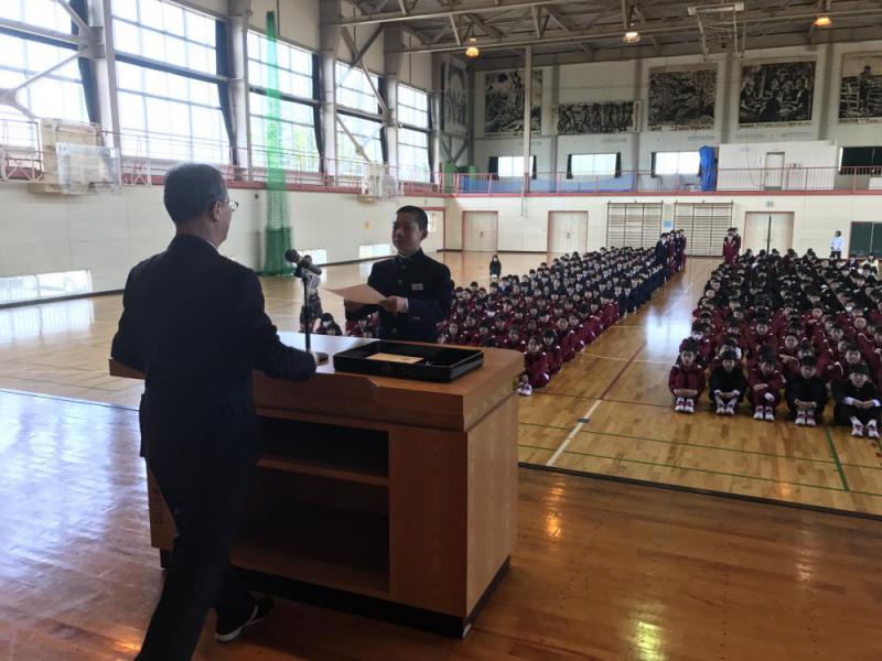 朝会にて、学級委員、生徒会役員の認証式が行われました。