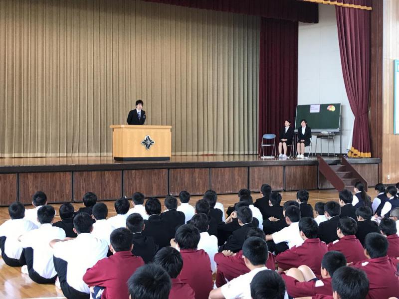5/30全校朝会にて3名の教育実習生の先生方の紹介がありました。