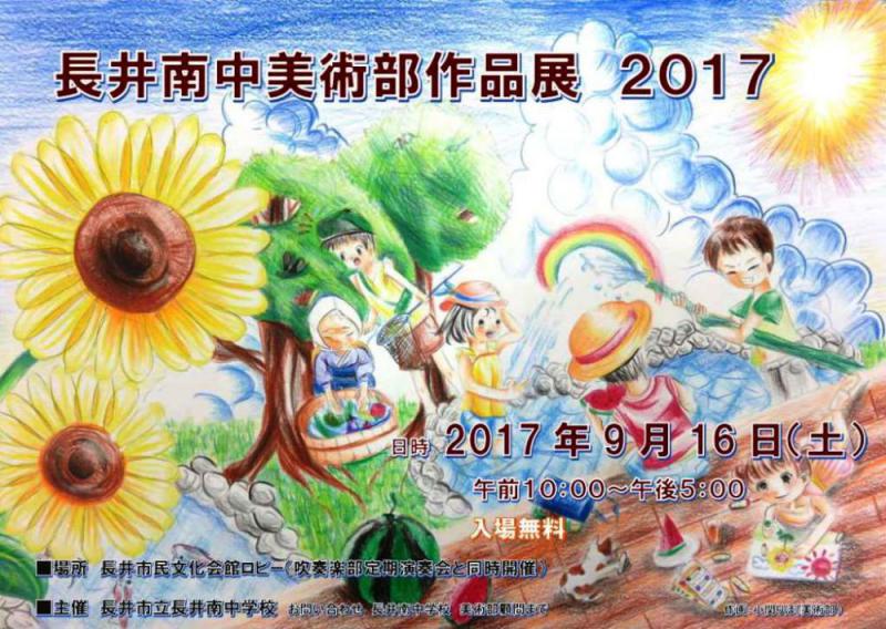 長井南中美術部作品展2017が9月16日(土)午前10時から午後5時まで長井市民文化会館ロビーにて行われます。この日はホールでは吹奏楽部定期演奏会があり、同日開催になっております。みなさん是非いらしてください。