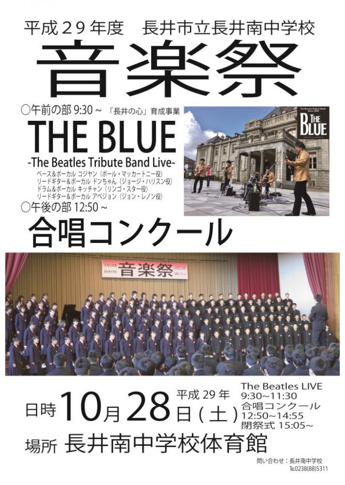 音楽祭が10月28日(土)に行われます。今年度は、午前中にビートルズトリビュートバンド THE Blueをお招きして、ビートルズの曲のライブを。午後は合唱コンクールが行われます。みなさんぜひいらしてください。