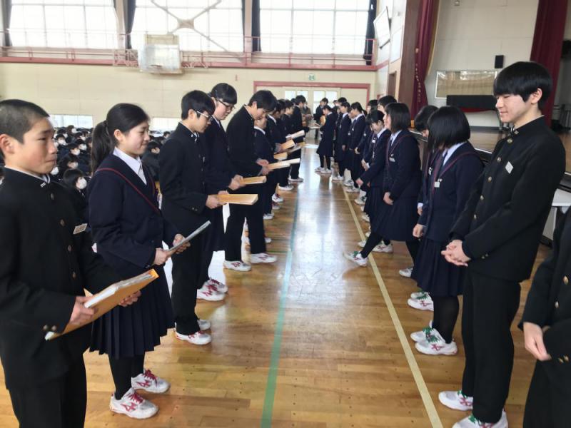 臨時生徒総会と生徒会役員の新旧の引き継ぎが行われました。