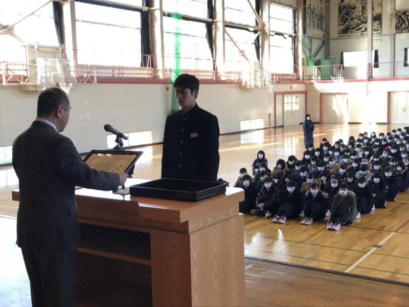 2/26 長井教育会 理事長 蒲生直樹様、事務局長 土屋正人様が来校され、長井教育会賞授与式が行われました。受賞者は、生徒会長 川村駿くんです。