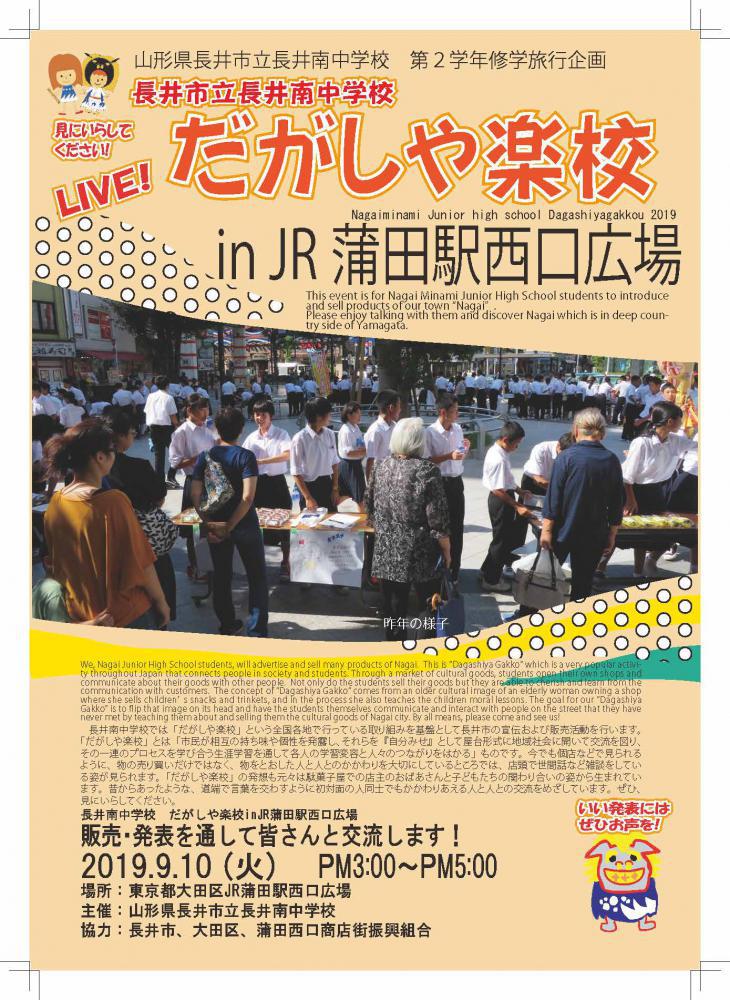 9月10日 午後3時よりJR蒲田駅西口広場にて、今年も修学旅行で2学年の生徒が「だがしや楽校」を開催します。長井の特産品の販売と魅力の紹介を通して訪れた人たちとの会話を楽しむ企画です。たくさんの皆様のご来場をお待ちしております。