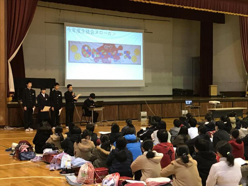 来年度、本校に入学する小学6年生のみなさんを招いて中学校説明会が行われました。生徒会役員の生徒による学校紹介の様子です。