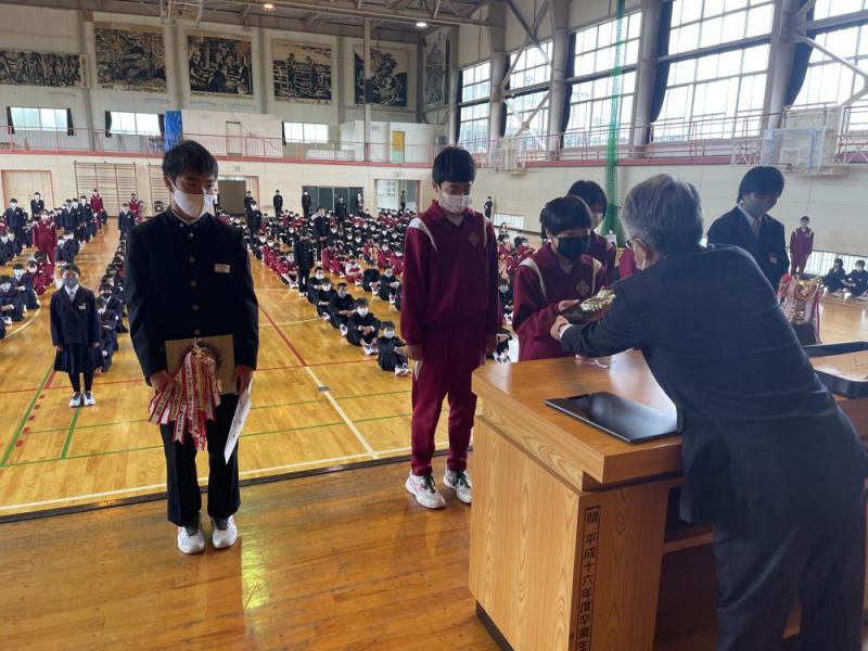 全校集会にて各種大会の表彰伝達が行われました。駅伝大会は男女ともに2位で県大会出場です。詳しい結果は学校だよりをご覧ください。