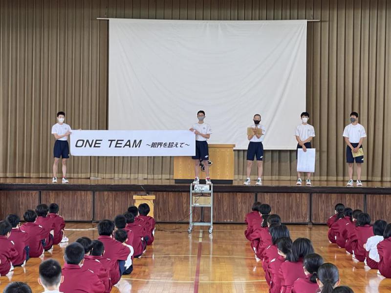 6/5生徒集会にて応援団より6/19、20に行われる地区大会に向けてのスローガンの発表がありました。