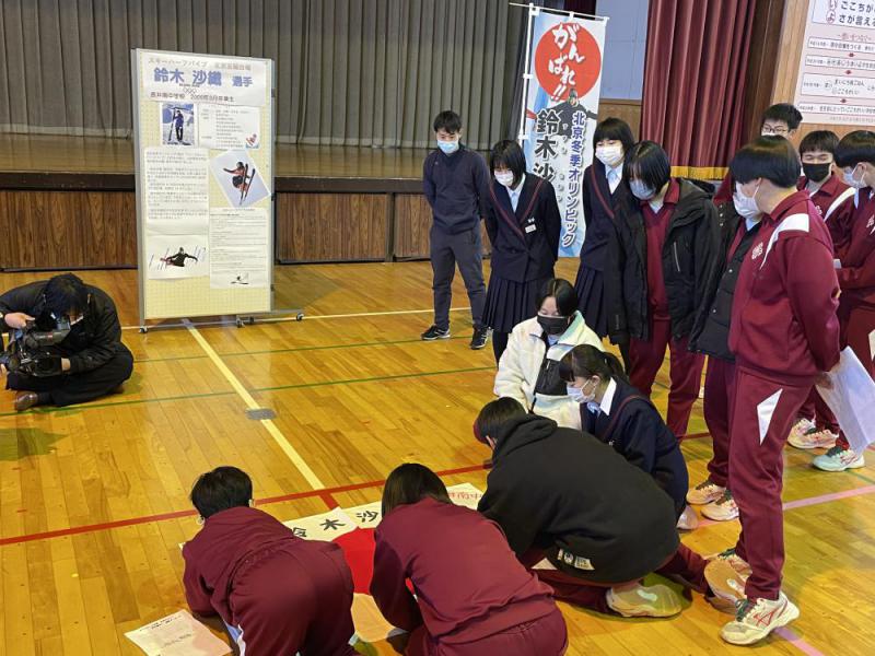 北京冬季オリンピック スキーハーフパイプに出場する本校出身の鈴木沙織選手への応援メッセージの記入が行われました。