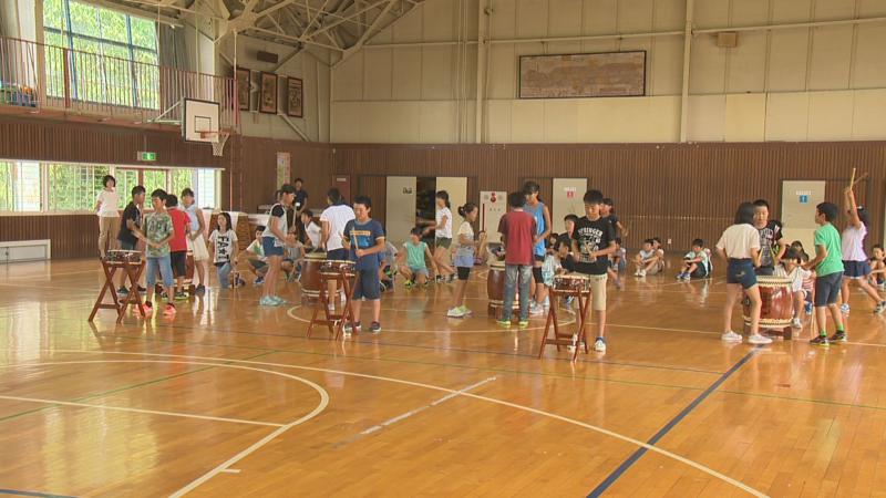 最初は体育館で歓迎会。次に小学校裏の親水公園でのイワナのつかみ取りを行いました。画像は歓迎会の時の和田小6年生が豊年太鼓を披露した時のものです。