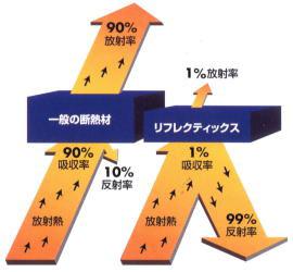 アルミホイルの低熱放出性、空気の低熱伝導性の利点からリフレクティックスは、両面に空気層を合わせ持つ事で輻射熱を反射して伝導熱を断熱することができます。