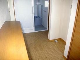 写真右手奥に洗濯機を置きます。取り込んだ洗濯物は左手前の台へ。室内には、脱着可能な洗濯物干しを設置。雨の日も安心の洗濯室です。