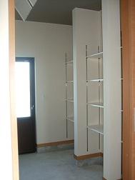 3畳の広さがある、主婦の皆さんに絶賛の勝手口。大容量の稼働棚も使いやすさ満点です。土間だから家庭菜園からの採れたての野菜を保存するのにも最適。
