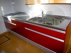 玄関ドアとおそろいの赤のシステムキッチン。キッチンと向かい合っておいているカップボードも赤で統一。赤は食欲をそそる色と言われています。二人で料理をしても余裕のひろびろキッチンです。