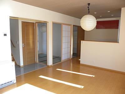 吹付発砲断熱材の威力発揮の暖かいリビングです。障子の向こうはお茶室の趣のある和室。障子を間仕切りに利用しているのがポイントです。