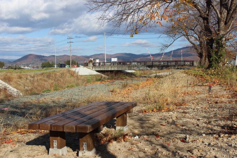 弊社で施工しています「岩崎川河川改修工事」の工区内河川敷にベンチを設置しました。