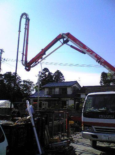 ポンプ車を利用して生コンを打設中です。