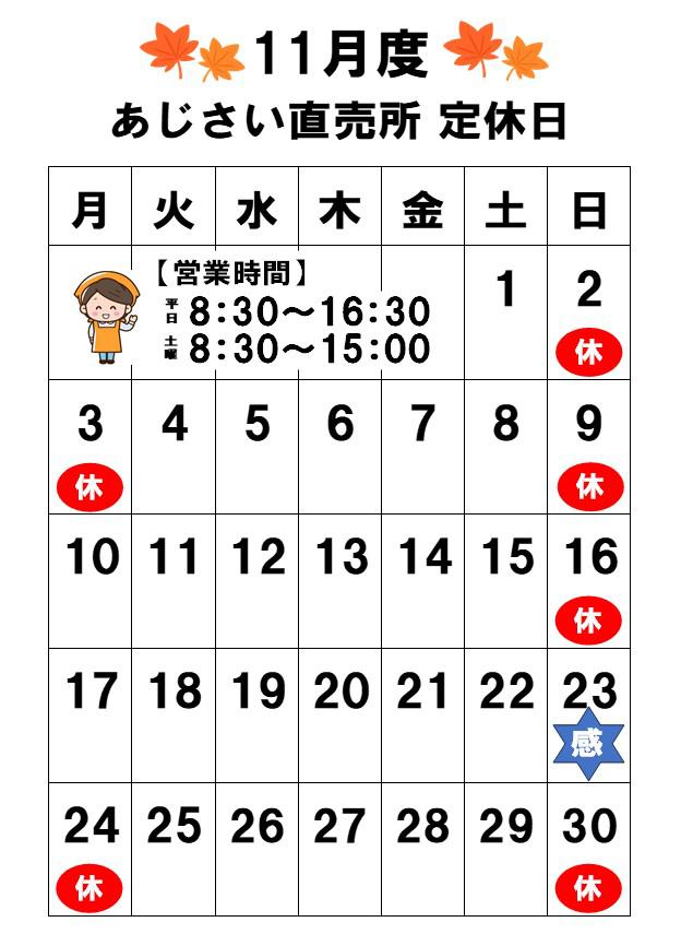 あじさい直売所11月の定休日をお知らせします。11月は毎週土曜日営業します。また、23日(日)は収穫感謝祭を開催予定です。
