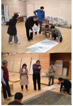 また、この日は芸工大の日本画研究室の方々が応援に駆けつけてくださり、倉庫から作品を出して梱包を解き、痛んでいる箇所には修復を施して再梱包・積み込みと、3時間程の作業に力を貸していただきました。
